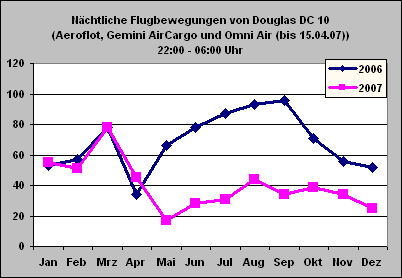 Die Anzahl der Flugbewegungen, insbesondere aber den nächtlichen Flugbewegungen mit Douglas DC 10 ist zum Glück für die lärmgeplagte Bevölkerung in den An- und Abflugkorridoren nachhaltig zurückgegangen. Laut unseren Aufzeichnungen ist seit dem 16. April 2007 keine Maschine von Omni Air Express mehr auf dem Flugplatz Hahn zwischengelandet.