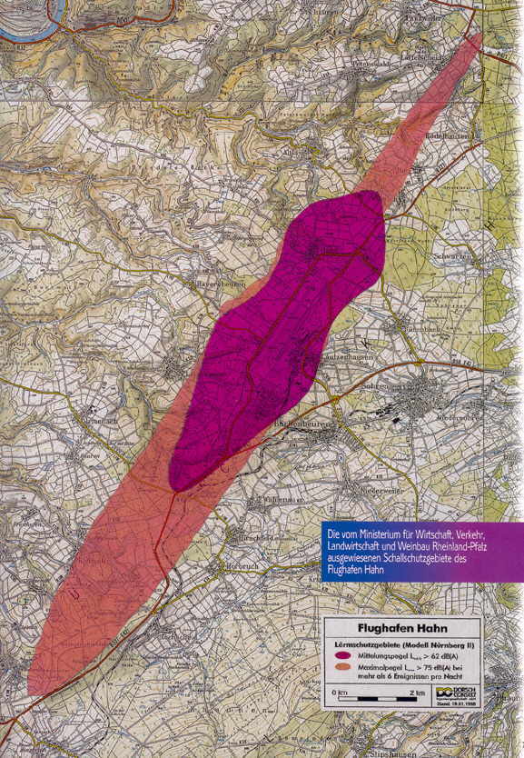 | Ausgewiesene Schallschutzgebiete des Flughafens Hahn (112kB) (Ansicht im Browser ggf. vergrößern) |