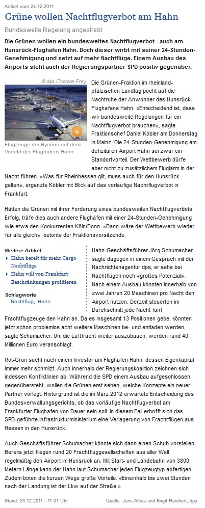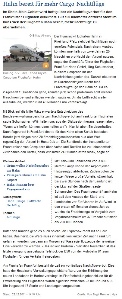 Berichterstattung im SWR "Zu Sache" am 13.10.2011 zu der Verlagerung von Nachtflügen von Frankfurt auf den Hahn |