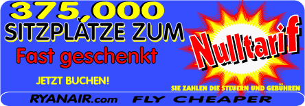 | 08.09.2004 | verschiedene Destinationen | kostenlos | excl. | 09/04 - 01/05 | 375.000 Sitzplätze Fast geschenkt |