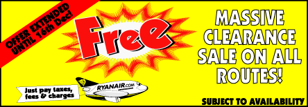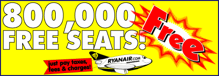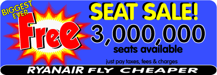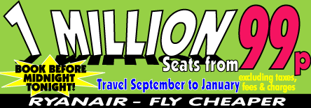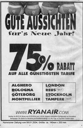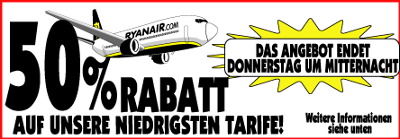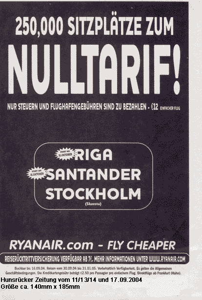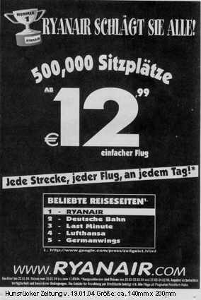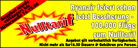 | 20.08.2004 | verschiedene Destinationen | 12,90€ | incl. | 09/04 - 01/05 | Ryanairs 900.000 12,90 € incl. Steuern und Gebühren |