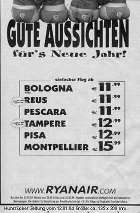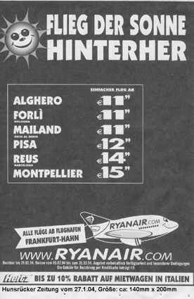 | 06.03.2004 | von Mailand, London oder Glasgow nach Hahn | 9,99€/ 1,29£/ 0,08£ |