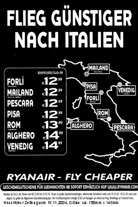 | 18.01.2004 | von Mailand, London oder Glasgow nach Hahn | 0,25€/ 1,99£/ 3,99£ |
