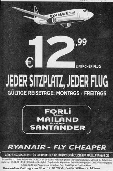 | 10.10.2004 | von Shannon, London oder Glasgow nach Hahn | 8,99€/ 1,99£/ 0,99£ |