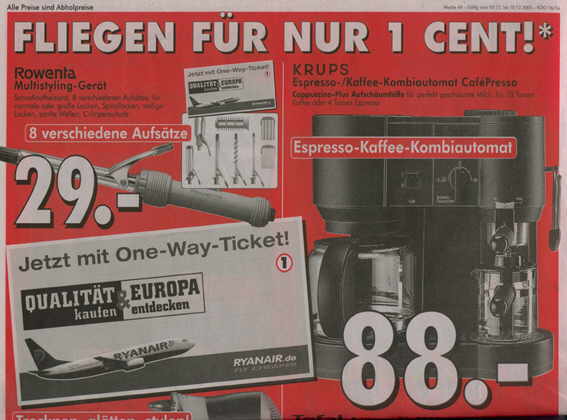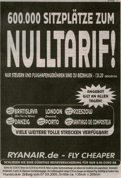 | 13.05.2005 | Div. Destinationen | 0,99 £ | excl.. | Cheapest Fares to Germany 0,99 £ | ||
