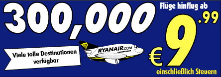 | 05.02.2005 | Alle Destinationen | 9,99 Euro | incl. | 300.000 Flüge ab 9,99 incl. Steuern | ||