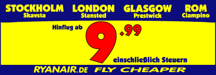 | 24.01.2005 | Stockholm, London, Glasgow, Rom | 9,99 Euro | incl. | Hinflug ab 9,99 incl. Steuern | ||