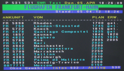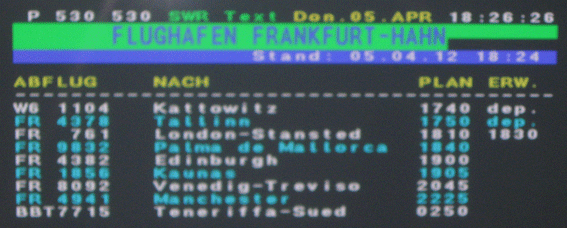Bei unserer Recherche sind wir im Südwest-Videotext auf den Seiten 530 - Abflug - und 531 - Anflug - auf Starts und Landungen einer Air Bashkortostan (Kürzel BBT) gestoßen, die offensichtlich regelmäßig nachts (Hinflug am Freitag, Rückflug am Samstag) auf dem Weg von Moskau nach Teneriffa auf dem Flughafen Frankfurt-Hahn zwischenlandet, um aufzutanken. Laut Internet besteht die Flotte der Air Bashkortostan mit Sitz in Ufa (Russland) aus einem Flugzeug des Typs Boeing B 757-200.