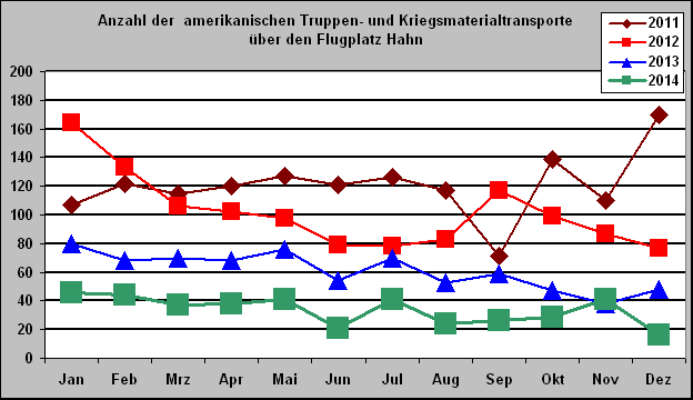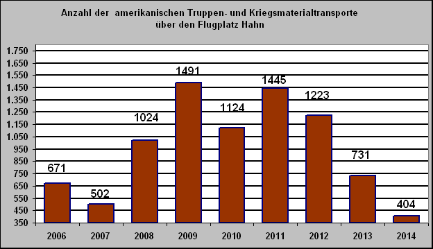 Im Jahr 2014 registrierte die Bürgerinitiative gegen den Nachtflughafen Hahn (BI) nur noch 404 Flüge = 808 Flugbewegungen bei den sogenannten "zivilen" Militärflügen. Im Vergleichszeitraum des Vorjahres waren es noch 731 Flüge (1.462 Flugbewegungen). So wurden nach unseren Aufzeichnungen bspw. im Dezember 2014 nur noch 16 Flüge über den Flugplatz Hahn abgewickelt. Einbruch bei der Transitfracht, Rückgang bei den TransitpassagierenMit Stand vom 30. November 2014 (Die Dezemberzahlen hat die Arbeitsgemeinschaft Deutscher Verkehrsflughäfen noch nicht veröffentlicht) sank die Anzahl der bei diesen Flügen transportierten GIs um 13.345 von 77.392 im Vergleichszeitraum 2013 auf 64.047 im Jahr 2014. Dies entspricht einem Rückgang von ca. 17,25%. Ausblick 2015Für 2015 erwartet die Bürgerinitiative (BI) nach der kompletten Rückführung der Kampftruppen aus Afghanistan eine fast vollständige Einstellung der Flüge. Dies wird nicht ohne Auswirkung auf die Passagier- und Frachtstatistik bleiben. Eine Reduzierung der Transitpassagiere um ca. 80.000 und der Rückgang der Transitfracht um ca. 5.000 to halten wird durchaus für wahrscheinlich. Tiefe Spuren in Verkehrsergebnissen und UmsatzDer Truppenabzug des US-Militärs aus Afghanistan und in 2012 aus dem Irak hinterlässt tiefe Spuren in den Verkehrsergebnissen des Flugplatzes Frankfurt-Hahn GmbH und sicherlich auch im Umsatz der Flughafen Frankfurt-Hahn GmbH. UmsatzIm Umsatzbereich dürften die Einbussen besonders gravierend sind. Das US-Militär hat den Flugplatz Hahn größtenteils nachts angeflogen, weswegen höhere Start- und Landeentgelte fällig wurden. Gerüchten zufolge hat das US-Militär sogar höhere Start- und Landeentgelte gezahlt, als in den Gebührentabellen ausgewiesen. FlugbewegungenSeit dem Spitzenjahr 2011 mit 1.445 Flügen = 2.890 Flugbewegungen ist das Flugaufkommen bei den "zivilen" Militärflügen stetig zurück gegangen. Umgerechnet auf den Tag gab es 2011 täglich (!) ca. 4 Flüge, 2014 waren es gerade mal täglich 1,1 Flüge. Transitfracht, TransitpassagiereSo wurden im Spitzenjahr auf der ehemaligen Airbase Hahn 141.396 Transitsoldaten bzw. 63.570 to Militärgüter umgeschlagen.