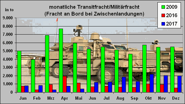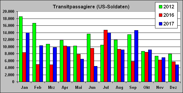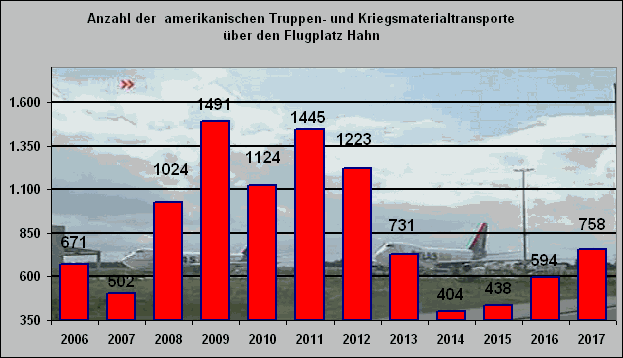 Flughafen Frankfurt-Hahn 2017: Deutlicher Zuwachs der Nutzung durch das US-Militär, 1.516 Flüge, 113.685 Transit-US-Soldaten, ca. 10.000 militärische Tonnen Transit-Fracht | |