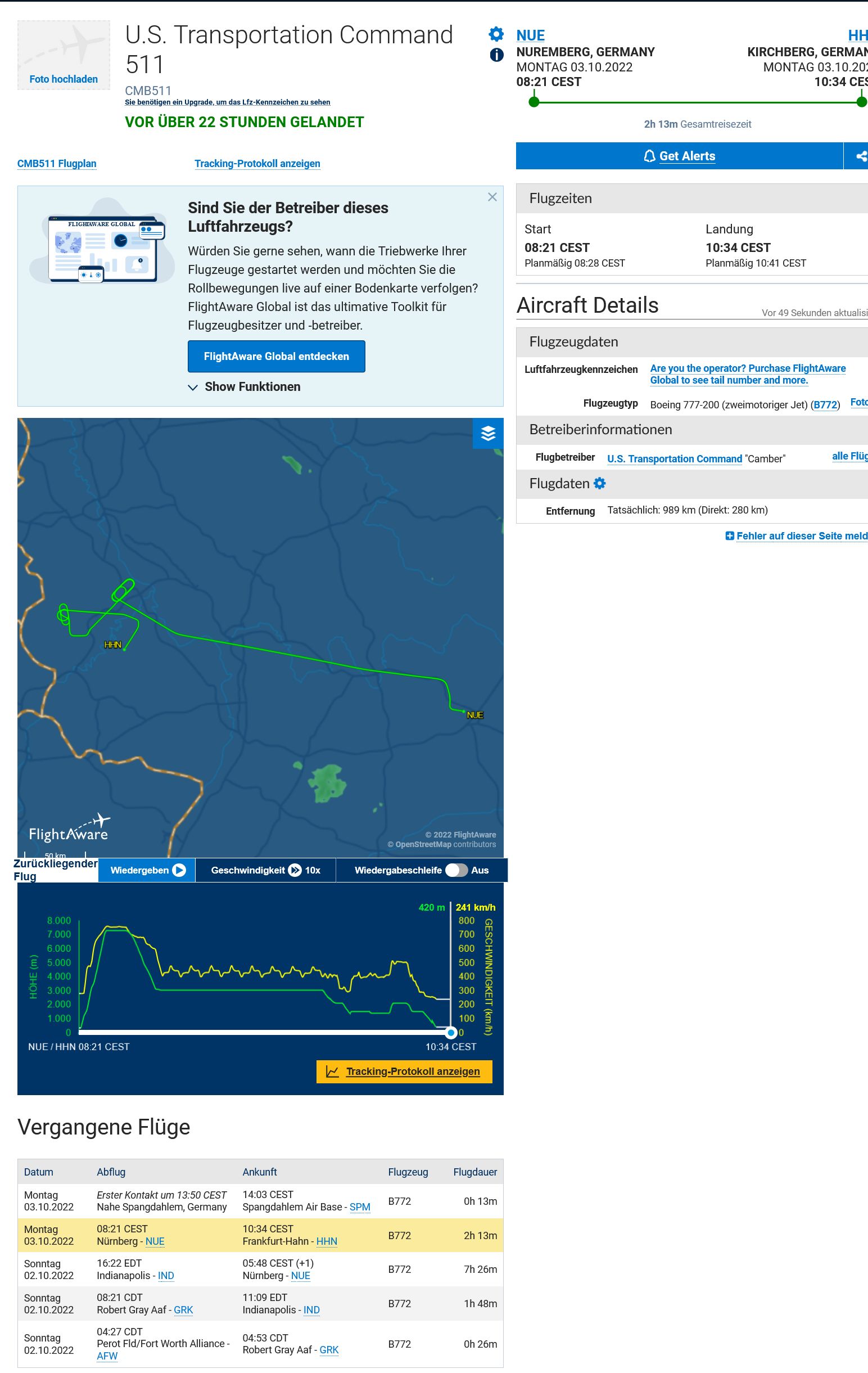 Am 03.10.2022 startete um 08:21 Uhr eine Boeing 777-200 der im Auftrag des amerikanischen Militärs fliegenden Fluggesellschaft Omni Air International mit dem Kennzeichen N486AX und der Flugnummer CMB511 (CMB=US-Transportation Command) in Richtung USA-Ostküste. An Bord befanden sich abgelöste Besatzungstruppen aus den bayrischen Standorten der US-Armee.