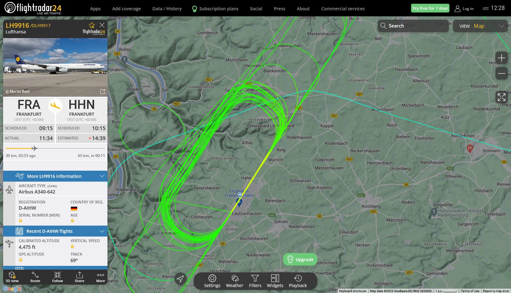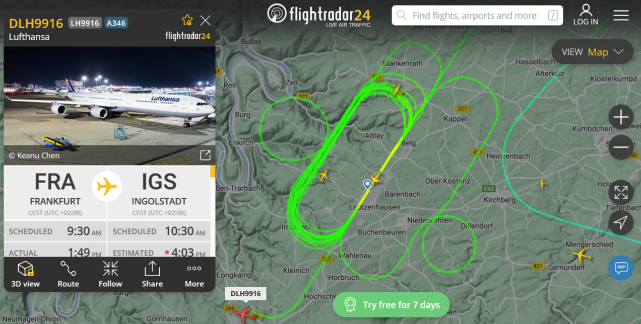 Die D-AIHW flog demzufolge am 23.06.2023 nach New York, am 24.06.2023 nach Bogota und am 25.06.2023 nach Hongkong. Aus Hongkong kommend landete die Maschine - wahrscheinlich verspätet- am 28.06.2023 erst um 07:31 Uhr in Frankfurt. Aussage der Lufthansa: Schlechte Wetterlage im KorridorEs war wahrscheinlich zu spät, um den für 09:30 Uhr geplanten Flug mit der Flugnummer LH 9916 nach Ingoldstadt, tatsächlich Manching, wie geplant durchzuführen. Deswegen wurde der Flug auf den Nachmittag und zum Flughafen Frankfurt-Hahn verlegt. Das mit dem schlechten Wetter im Korridor" halten wir für eine billige, leicht zu durchschauende Ausrede. Unsere Recherche hat keinen Anhaltspunkt für Schneefall, Blitzeis, monsunartige Regenfälle oder einen Hurrikan am 28.06.2023 im Raum Ingoldstadt ergeben. Aussage der Lufthansa: Flug über dem Hunsrück war AusnahmeAuch die Aussage, dass der Flug über dem Hunsrück als Ausnahme zu sehen sei, ist unwahr. Es handelt sich nicht um einen extrem seltenen Einzelfall. Mit der gleichen Maschine - Airbus A 340-642, Kennzeichen D-AIHW- wurden bereits am Donnerstag, den 04.05.2023 in der Zeit von 11:30 - 14:15 Platzrundenflüge/wiederholte Anflüge (go-around und touch and go) im Rahmen des Pilotentrainings am Hahn durchgeführt.