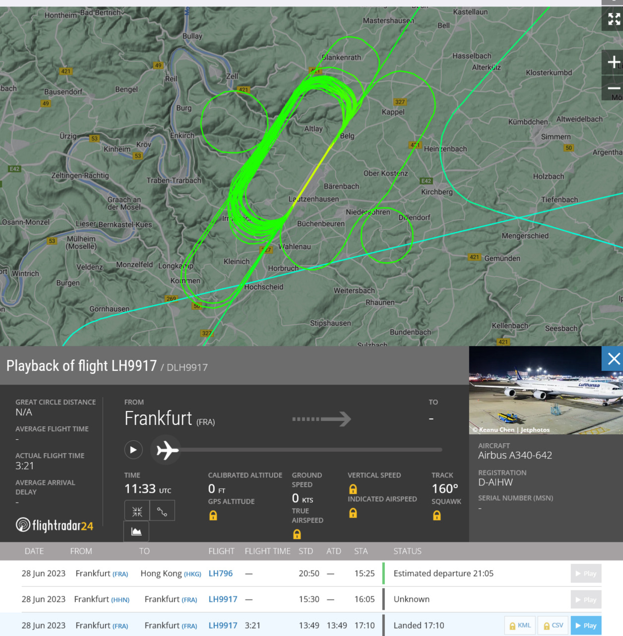 Der Trierische Volksfreund (TV) berichtete am 30.06.2023 unter der Überschrift: LH9916 gibt Rätsel auf: Warum ein Airbus stundenlang über dem Hunsrück kreiste. "Es sei ein "Werkstattflug" gewesen. Bei der Maschine mit dem Kennung LH9916 handele es sich um einen kürzlich erst wieder reaktivierten Airbus A340-600. Das vierstrahlige Langsteckenflugzeug war wegen der Corona-Krise vorübergehend in Spanien stillgelegt worden und wird nun wieder in Dienst gestellt. Dafür müssen bestimmte Tests ausgeführt werden, für die dem Flugzeug ein bestimmter Flugraum zugeteilt wird. In diesem Fall war der Flugraum in Lautzenhausen ein Ausweichflugraum, weil der ursprüngliche Korridor wegen schlechten Wetters nicht zur Verfügung stand. Generell würde viel am Simulator trainiert aber gewisse Manöver müssten in der Realität geflogen werden, was auch die Flugsicherheit vorschreibe. Dass das ausgerechnet über dem Hunsrück stattfand, sei als Ausnahme zu sehen." Diese Aussagen haben wir überprüft und sind zu einem ernüchternden Ergebnis gekommen. Sie sind völlig unglaubwürdig und stellenweise geradezu hanebüchen. Die Fakten ergeben eine völlig andere Sachlage. Aussage der Lufthansa: Werkstattflug und "nun wieder in Dienst gestellt"Flug LH9916 ist tatsächlich Flug LH9917. Flug LH9917 wurde mit einem Airbus A 340-642 der Lufthansa mit dem Kennzeichen D-AIHW durchgeführt. Dies lässt sich anhand der identischen Flugspuraufzeichnungen erkennen: