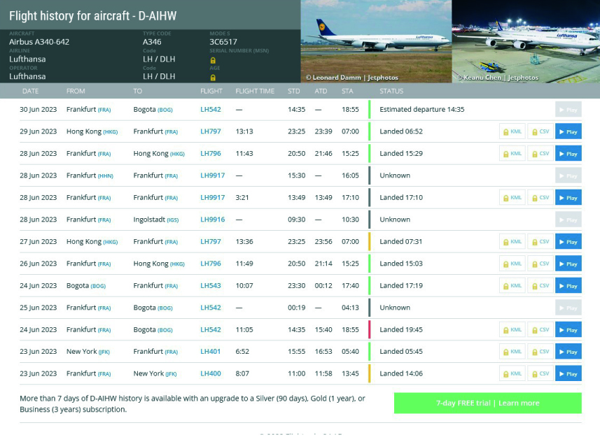 Bereits anhand dieser Flugspuraufzeichnung kann selbst ein Laie erkennen, dass es sich nicht um einen "Werkstattflug" gehandelt hat, sondern um "Pilotentraining". Warum sollte auch bei einem "Werkstattflug" stundenlang immer wieder das gleiche Manöver geflogen werden? Das es sich auch nicht um einen "Werkstattflug" einer Maschine, die "nun wieder in Dienst gestellt wird", sondern um eine Maschine, die aus dem Liniendienst für Pilotentraining abgestellt wurde, lässt sich auf nachfolgendem Flugplan des Airbus A340 mit dem Kennzeichen D-AIHW für den Zeitraum vom 23.06. bis zum 30.06.2023 erkennen.