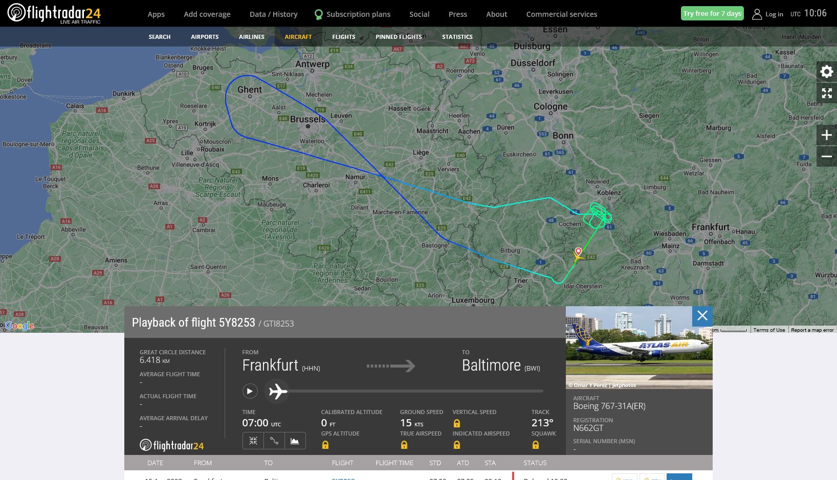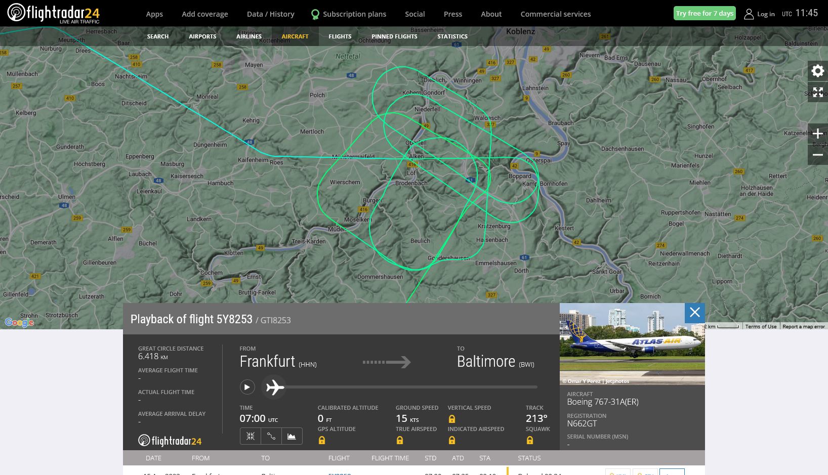 Eine Boeing B 767-300 des amerikanischen Militärlogistikers Atlas Air mit dem Kennzeichen N662GT musste bei einem Flug vom Flughafen Frankfurt-Hahn nach Baltimore in den USA den Flug (Flugnummer GTI8253), vermutlich wegen eines technischen Defekts, abbrechen und zum Flughafen Frankfurt-Hahn zurückkehren. Der Truppentransporter von Atlas Air war am 14.04.2023 um 09:01 (Ortszeit) in Hahn gestartet. Um ca. 09:30 legte die B 767-300 kurz hinter Gent in Belgien eine 180-Grad-Kehre hin und bog Richtung Süd ab. ![]() Gesamte Streckenführung des Fluges (Zum Vergröpern bitte anklicken) Kurvenflüge im Raum Koblenz - Kerosinablass?Um ca. 10:00 Uhr erreichte die Maschine den Raum Koblenz und flog dort bis ca. 10:30 Uhr größere Schleifen und Ovale. Offensichtlich war das Flugzeug für eine Landung in Hahn zu schwer, und die Piloten mussten Treibstoff loswerden. Ob Treibstoff abgelassen wurde, ist nicht bekannt. Wenn ja, fällt dies wahrscheinlich mal wieder unter "militärische Geheimhaltung". ![]() Flugaufzeichnungen im Raum Koblenz (Zum Vergrößern bitte anklicken) Die Maschine landete um 10:43 wieder am Flughafen Frankfurt-Hahn. Truppentransporter mit GIs und Seeleuten