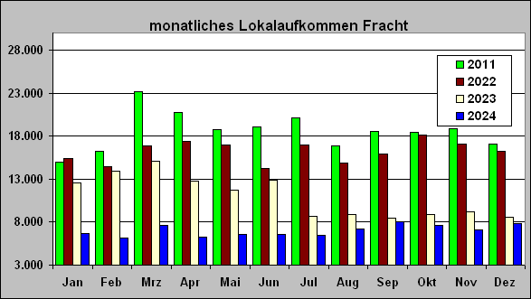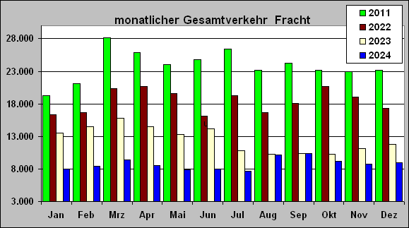 Die Arbeitsgemeinschaft Deutscher Verkehrsflughäfen (ADV) hat die Luftverkehrsstatistik für den November 2024 veröffentlicht. Danach ist das Frachtaufkommen am Triwo Flughafen Frankfurt-Hahn im November 2024 im Vergleich zum November 2023 um 2.402 to bzw. 21,54 % gesunken.11.152 to im November 2023 stehen nur noch 8.750 to im November 2024 entgegen. Im Vergleich des Zeitraums Januar bis November 2024 zum gleichen Zeitraum 2023 beträgt der Rückgang 42.284 to bzw. 30,51 %. Die absolute Frachtmenge sank von 138.574 to in 2023 auf nur noch 96.290 to in 2024. Und, in den 96.290 to sind noch 10.847 to (20,61%) nur statistisch wertvolle Transitfracht enthalten. Im Vorjahr waren es zum gleichen Zeitpunkt nur 15.643 to. Der Anteil am Gesamtaufkommen betrug nur 11,29%. |