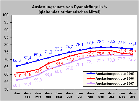 Das krasse Mißverhältnisse zwischen der Steigerung des Sitzplatzangebotes und der Zunahme der Passagierzahlen zeigt die erwartete gravierende Auswirkung auf die Auslastungsquote der Maschinen. Lag diese im letzten Jahr noch bei durchschnittlich 76,96 Prozent, so sank sie im Jahr 2006 auf nur noch 73,65 Prozent.