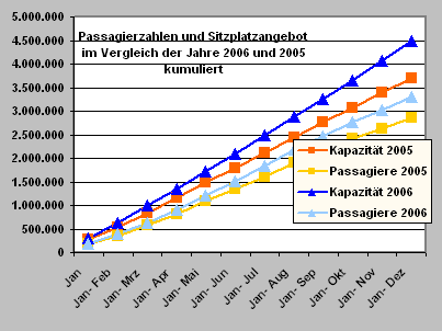 In der Addition der einzelnen Monate des Jahres 2006 stieg das Angebot auf insgesamt 4.483.038 Sitzplätze, gegenüber lediglich 3.703.659 im Vergleichszeitraum des Vorjahres. Dies entspricht einer Steigerung um 779.379 Sitze = 21,04 %.