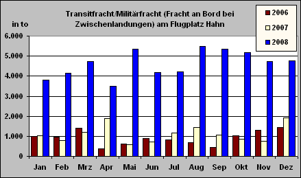 Besonders auffallend ist die gravierende Steigerung um 314 % bei der Transitfracht. Bei dieser Transitfracht handelt es sich nicht um "Luftfracht" im originären Sinne, sondern um Nachschubgüter wie bspw. schwergepanzerte Mannschaftstransportwagen (MRAPs), Bomben, Waffen und sonstiges Kriegsmaterial für die amerikanischen Besatzungstruppen im Irak und in Afghanistan. Es befindet sich an Bord von Flugzeugen, die auf dem Flugplatz Hahn zwischenlanden, um aufzutanken. |