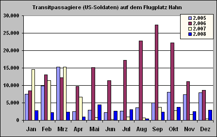Die bei den sogenannten "zivilen Militärflügen" an Bord der Truppentransporter befindlichen Soldaten fließen als "Transitpassagiere" in die Hahner Passagierstatistik ein und schönen die Bilanz. Gleiches gilt für das Kriegsmaterial, dass sich an Bord der vom amerikanischen Pentagon gecharterten Versorgungsflugzeuge befindet. Dieses fließt als "Transitfracht" in die Hahner Frachtstatistik ein. Mit Stand des 30.11.2007 wurden am Flugplatz Hahn im Jahr 2007 ca. 59.000 Soldaten zwischengelandet. Im Vorjahr waren es zum gleichen Zeitpunkt bereits knapp 160.000. |