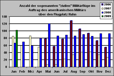 Was ansonsten an militärischen Versorgungsgütern der US-Streitkräfte, größtenteils von der Dover US-Airforce-Base, der Mc-Guiere Airforce oder der Charleston Airforce Base kommend, über den Flugplatz Hahn transportiert wurde, ist völlig unbekannt. Angesichts der Geheimniskrämerei des Flughafenmanagements und der US-Streitkräfte ist zu befürchten, dass vorrangig Bomben, Minen, Munition, Sprengstoff oder "geheime" Spezialkräfte transportiert wurden.