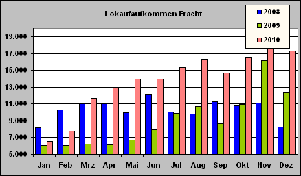 Gesamtjahr 2010LokalaufkommenIn 2010 wurden am Flugplatz Hahn insgesamt 167.158 to an lokaler Luftfracht umgeschlagen. Dies sind 59.202 to oder 54,84% mehr als in 2009, als 107.956 to abgefertigt wurden. TransitfrachtIn 2010 wurden am Flugplatz Hahn insgesamt 61.389 to Transitfracht gezählt. Dies sind 5.320 to oder 7,97% weniger als im Vergleichszeitraum des Vorjahres, als 66.709 to statistisch erfasst wurden. GesamtverkehrIn 2010 wurden am Flugplatz Hahn insgesamt 228.547 to Luftfracht gezählt. Dies sind 53.882 to oder 30,85% mehr als im Vergleichszeitraum des Vorjahres, als 174.665 to abgefertigt wurden. |