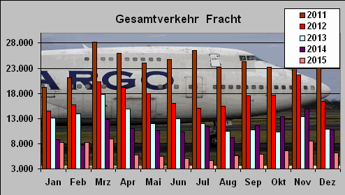 GesamtverkehrEinzelmonat Dezember 2015Am Flugplatz Hahn wurden im Dezember 2015 insgesamt 6.203 to Luftfracht gezählt. Dies waren 4.551 to bzw. 42,32% weniger als im Dezember 2014, als 10.754 to registriert wurden. Gesamtjahr 2015In Zeitraum Januar bis Dezember 2015 wurden am Flugplatz Hahn insgesamt 79.662 to Luftfracht gezählt. Dies sind 52.974 to bzw. 39,94% weniger als im Vergleichszeitraum des Vorjahres, als 132.636 to in die Statistik geschrieben wurden. |