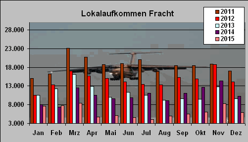 LokalaufkommenEinzelmonat Dezember 2015Am Flugplatz Hahn wurden im Dezember 2015 insgesamt 5.916 to lokale Luftfracht umgeschlagen. Dies waren 4.421 to bzw. 42,77% weniger als im Dezember 2014, als 10.337 to abgefertigt wurden. Gesamtjahr 2015Im Zeitraum Januar bis Dezember 2015 wurden am Flugplatz Hahn insgesamt 73.271 to lokale Luftfracht umgeschlagen. Dies sind 53.650 to bzw. 42,27% weniger als im Zeitraum Januar bis Dezember 2014, als 126.921 to abgefertigt wurden. |
