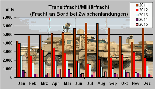 TransitfrachtEinzelmonat Dezember 2015Am Flugplatz Hahn wurden im Dezember 2015 insgesamt 287 to Transitfracht gezählt. Dies waren 130 to bzw. 31,18% weniger als im Dezember 2014, als 417 to beim Auftanken der Flugzeuge in die Hahner Frachtstatistik notiert worden. Gesamtjahr 2015Im Zeitraum Januar bis Dezember 2015 wurden am Flugplatz Hahn insgesamt 6.391 to Militärgüter als Transitfracht gezählt. Dies sind 676 to bzw. 11,83% mehr als im Vergleichszeitraum des Vorjahres, als 5.715 to statistisch erfasst wurden. |