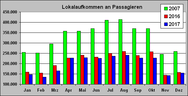 LokalaufkommenDezember 2017Das Lokalaufkommen, d.h. bei den echten Passagieren, verzeichnet der Flugplatz Hahn im Dezember 2017 im Vergleich zum Dezember 2016 einen Rückgang um 3.047 Passagieren, bzw 1,93%. Gesamtjahr 2017Das Lokalaufkommen ist im Zeitraum Januar bis Dezember 2017 um 154.892 bzw. 6,16% von 2.513.107 auf 2.358.215 gesunken. |